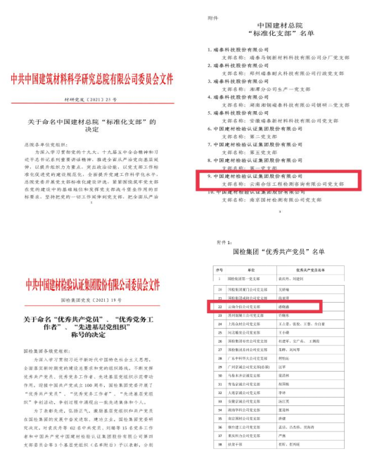 近日,根據(jù)中共中國(guó)建筑材料科學(xué)研究總院有限公司委員會(huì)印發(fā) 《關(guān)于命名中國(guó)建材總院“標(biāo)準(zhǔn)化支部”的決定》,云南合信工程檢測(cè)咨詢有限公司黨支部榮獲中國(guó)建材總院 “標(biāo)準(zhǔn)化支部”稱號(hào),支部黨員潘曉鑫獲國(guó)檢集團(tuán)“優(yōu)秀共產(chǎn)黨員”榮譽(yù)稱號(hào)。