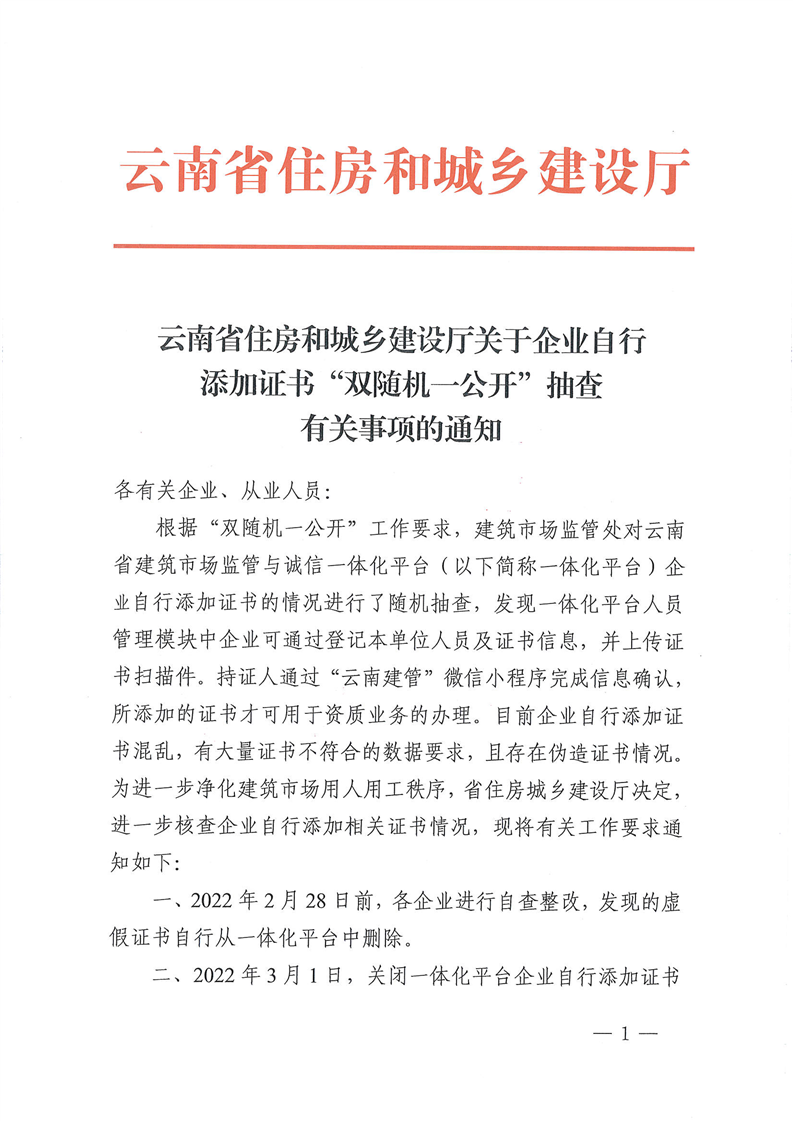 云南省住房和城鄉(xiāng)建設(shè)廳關(guān)于企業(yè)自行添加證書“雙隨機(jī)一公開”抽查有關(guān)事項的通知