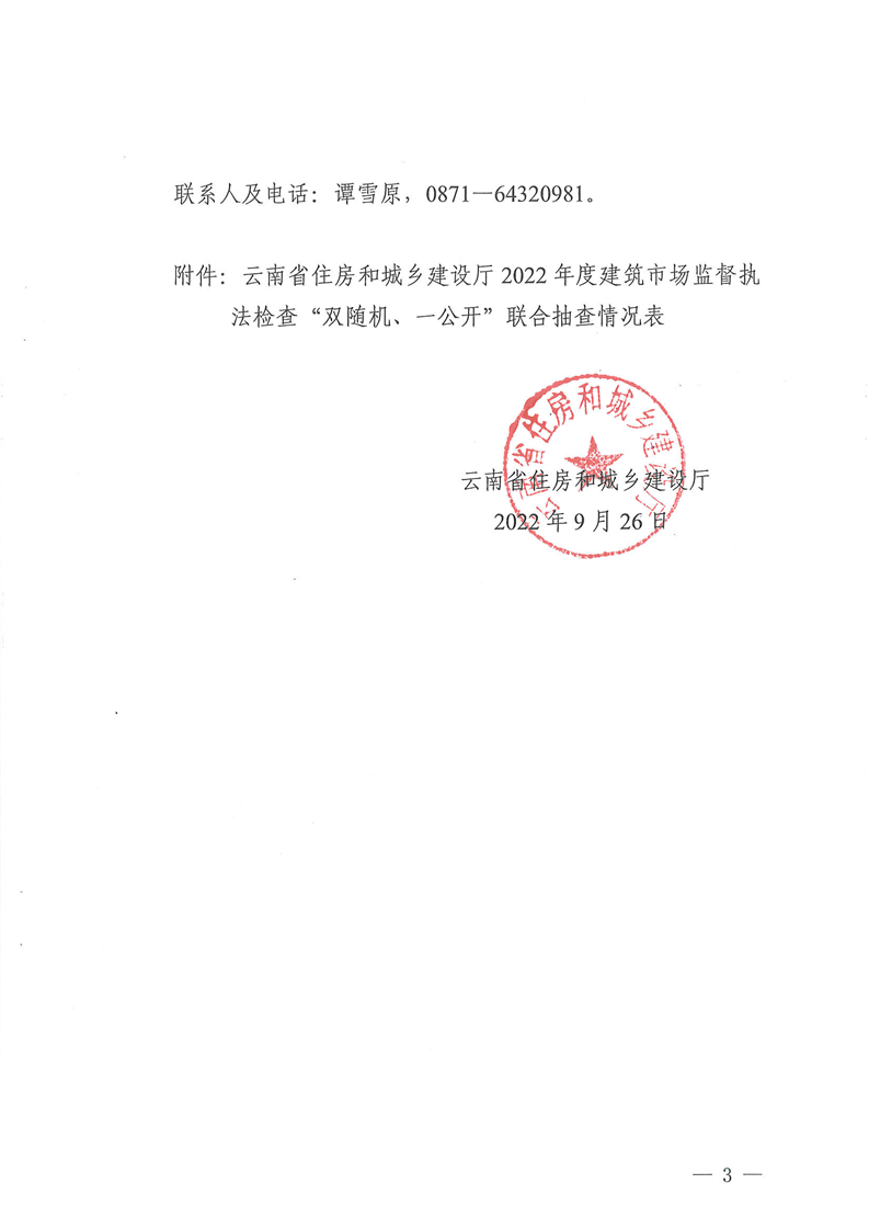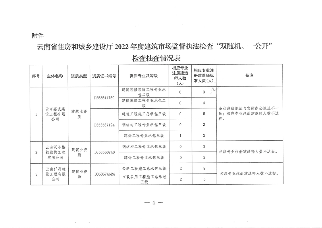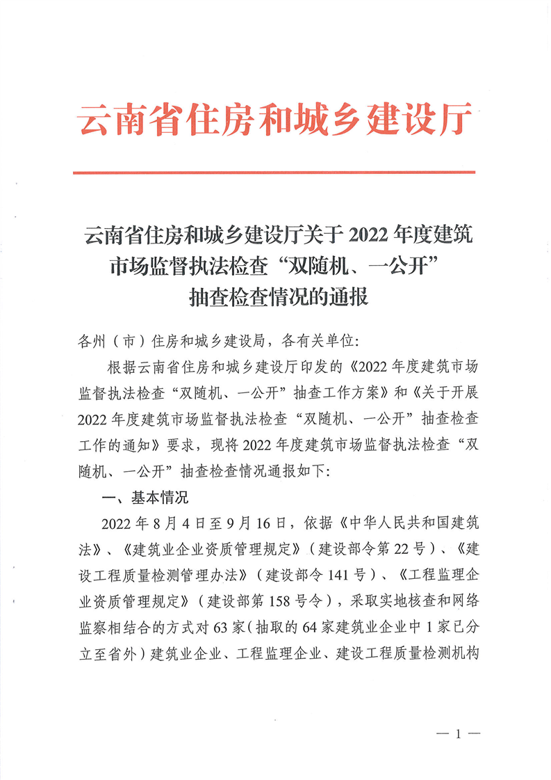 云南省住房和城鄉(xiāng)建設(shè)廳關(guān)于2022年度建筑市場監(jiān)督執(zhí)法檢查“雙隨機(jī)、一公開”抽查檢查情況的通報(bào)