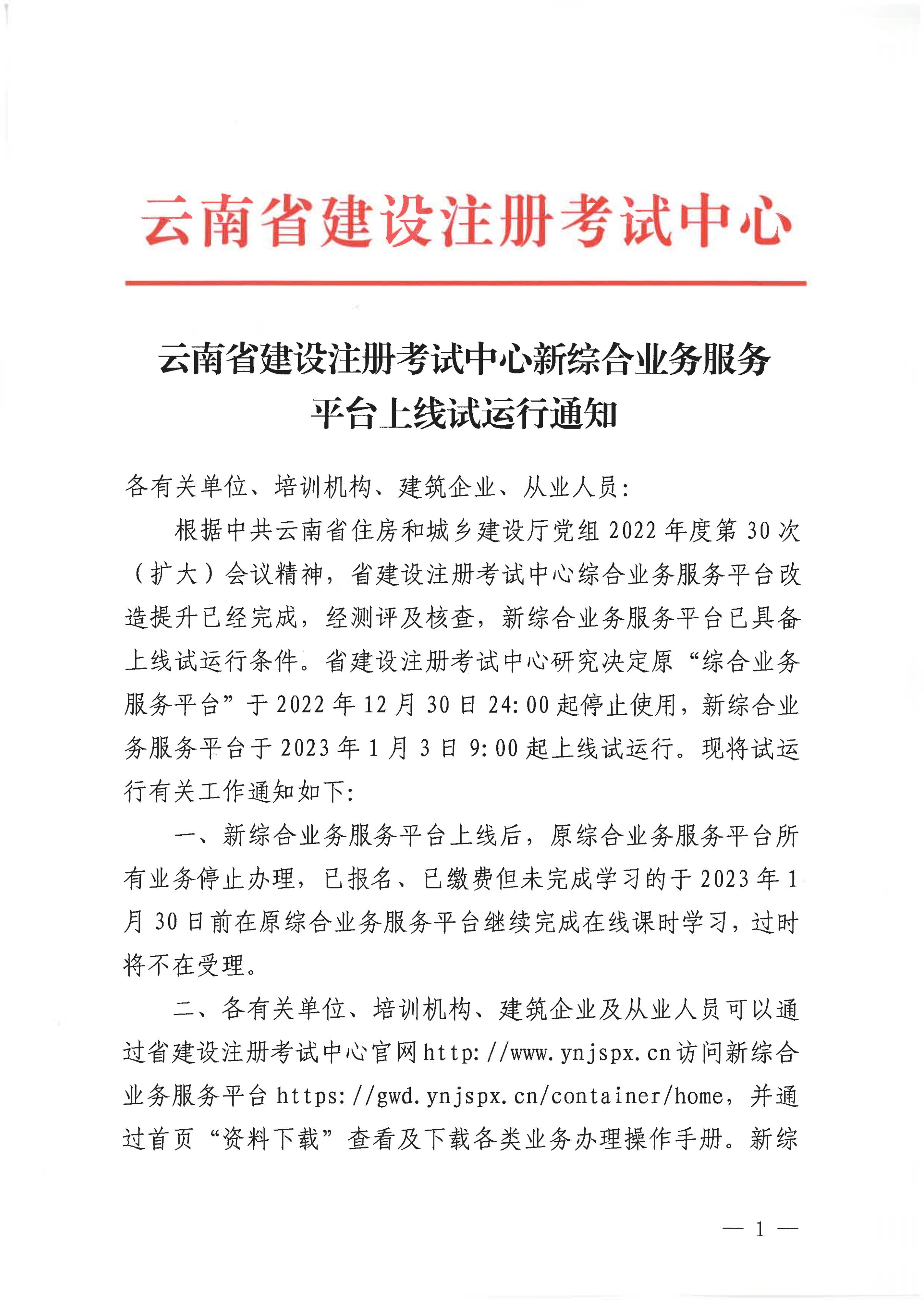 云南省建設注冊考試中心新綜合業(yè)務服務平臺上線試運行通知